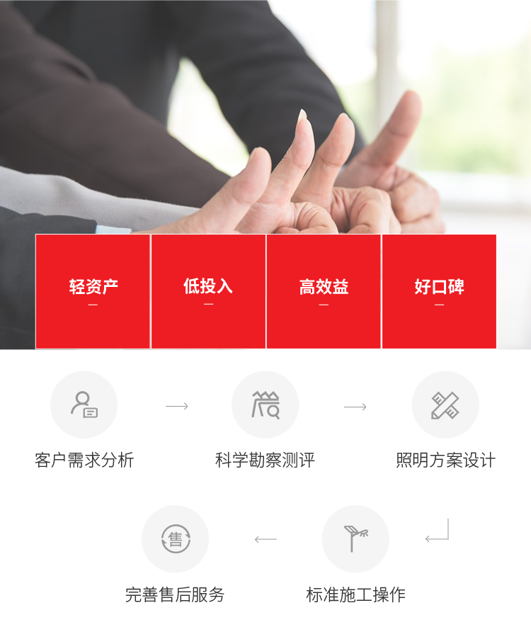 科(kē)學的(de)勘察和(hé)測評 全面了(le)解客戶照(zhào)明(míng)需求 專業(yè)設計(jì)的(de)照(zhào)明(m↑¥íng)系統方案 标準化(huà)的(de)施工(gōng)和(hé)操作(zuò)流程 -